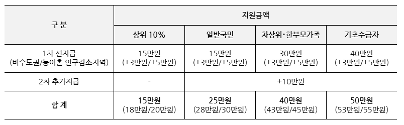 | 지급 금액 | 15만~40만 원 (계층별 차등) | 1인당 일률 10만 원 |