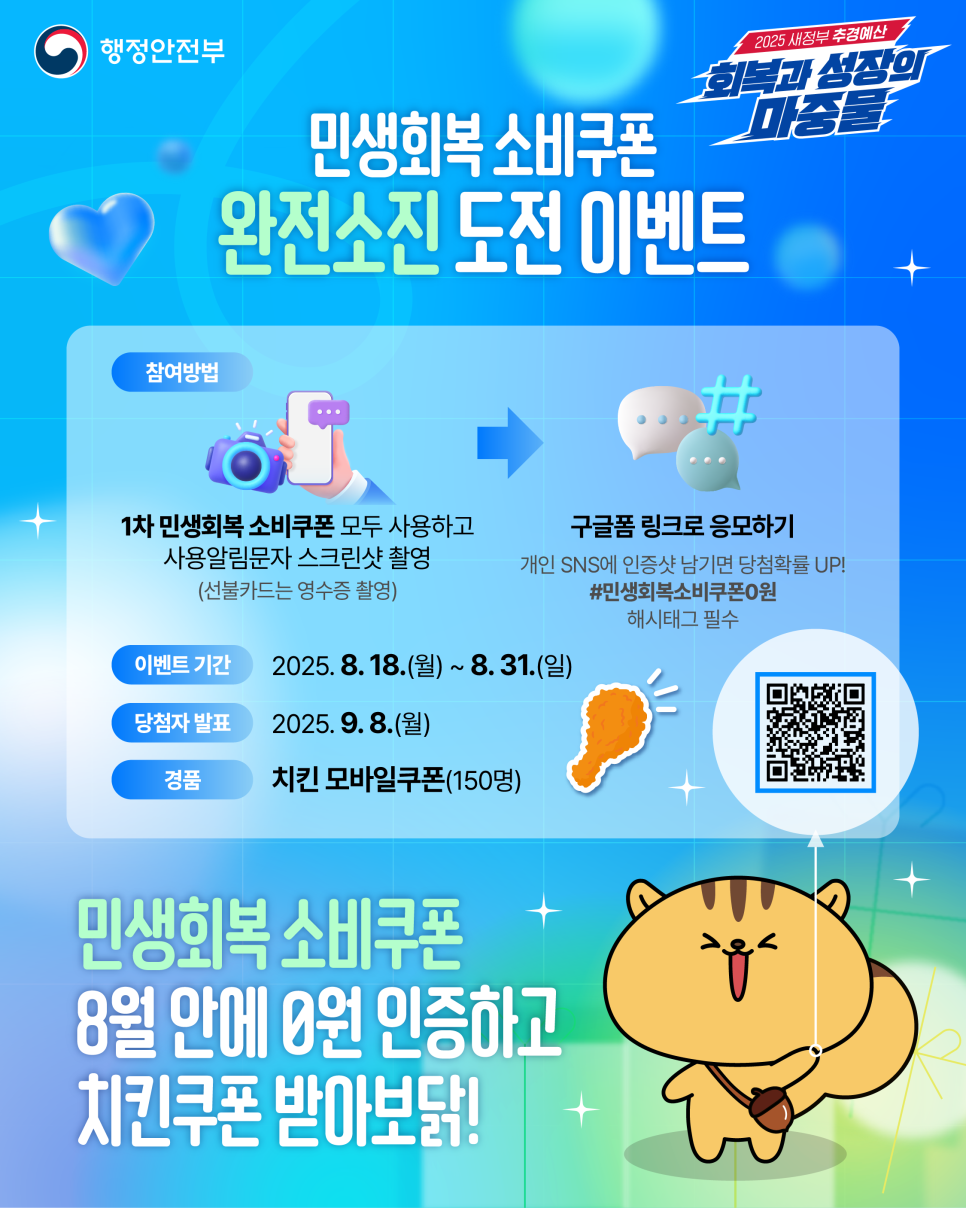 민생회복 소비쿠폰 완전 소진 도전 이벤트도 진행중이에요. 1차 소비쿠폰을 모두 사용하고 이벤트에 응모하면 치킨 모바일 쿠폰을 준대요!